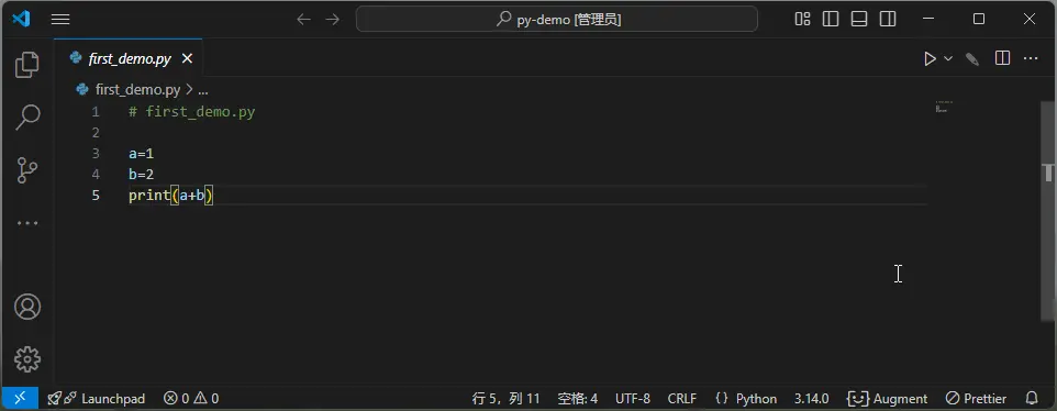 py first_demo.py 或者 python3 first_demo.py回车执行,即可看到脚本执行结果(也是解释器在底层工作,这种方式可以执行文件内所有的 python 代码,方便而已)!